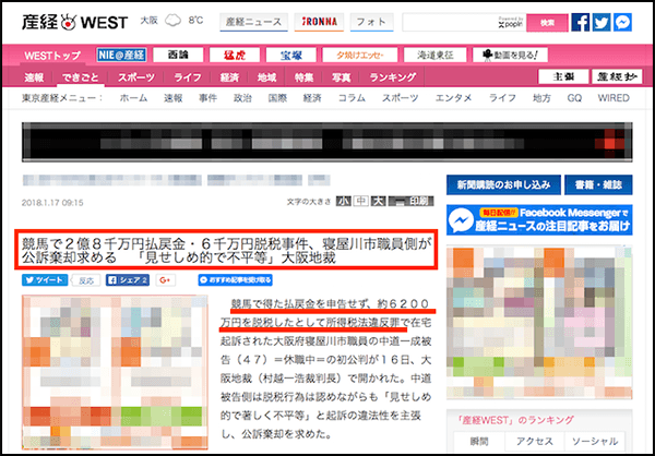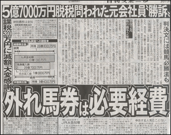 大阪・寝屋川市の男性(48)は、平成24年に約3460万円、26年に約1億4350万円の課税所得があったのに、 競馬の払戻金による所得はまったく申告せず、2年で所得税計約6200万円を脱税したとされる。