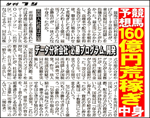 英国人が社長を務める東京都内のデータ分析会社が、競馬で得た配当金を申告せず、東京国税局から約160億円の所得隠しを指摘されていたことが分かった。