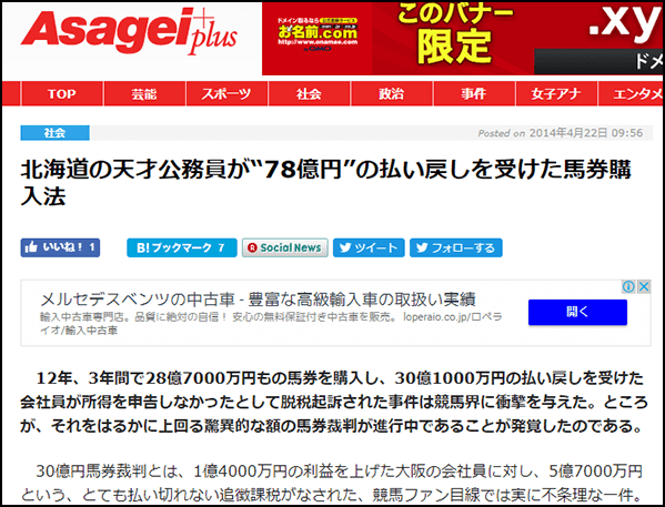 北海道の公務員男性(41)が2005年〜2010年の6年間で、72億7000万円分の馬券を購入し、払戻金は78億4000万円。